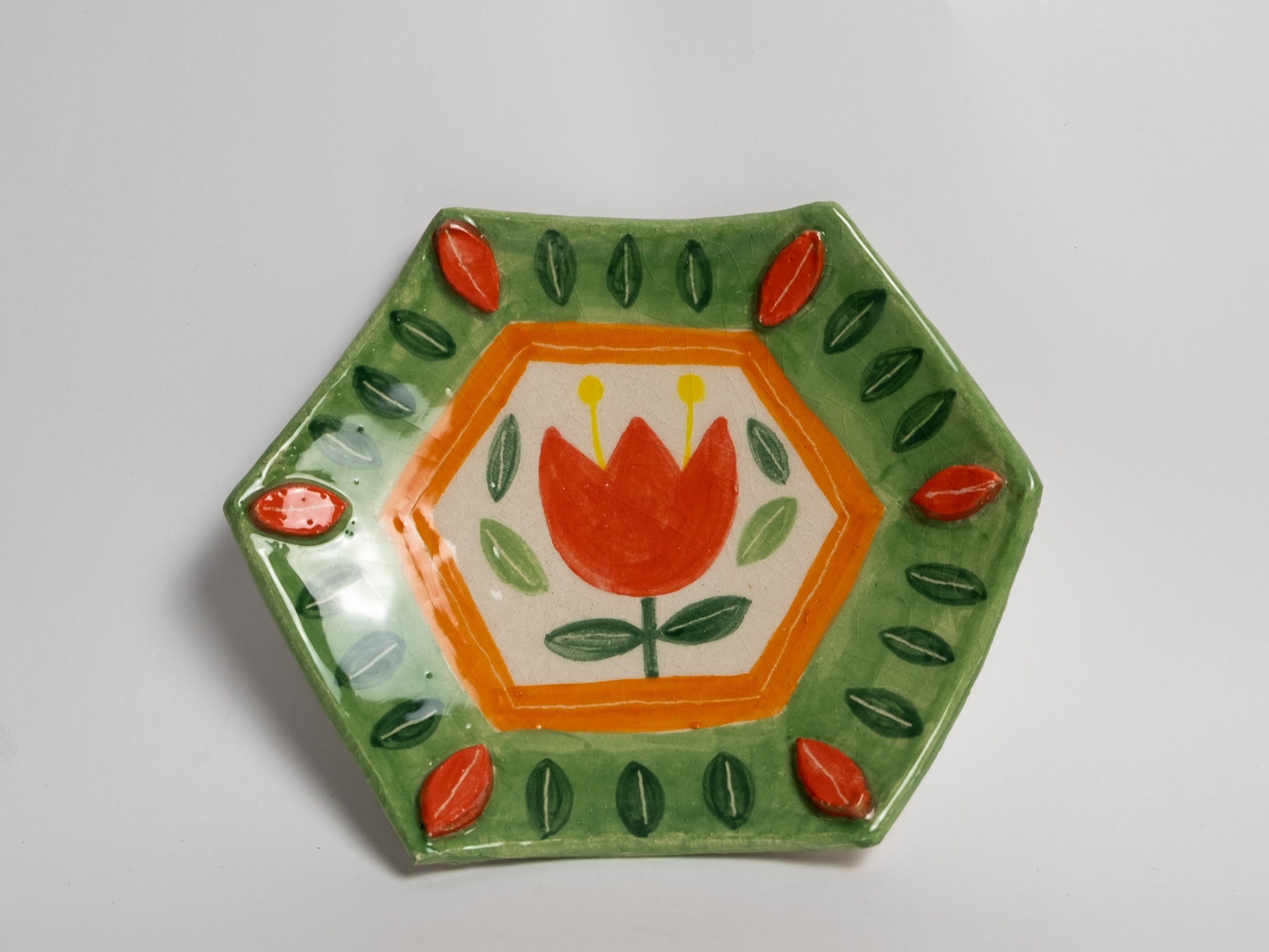 Prato hexagonal em cerâmica decorado com flor vermelha e padrões verdes e amarelos.