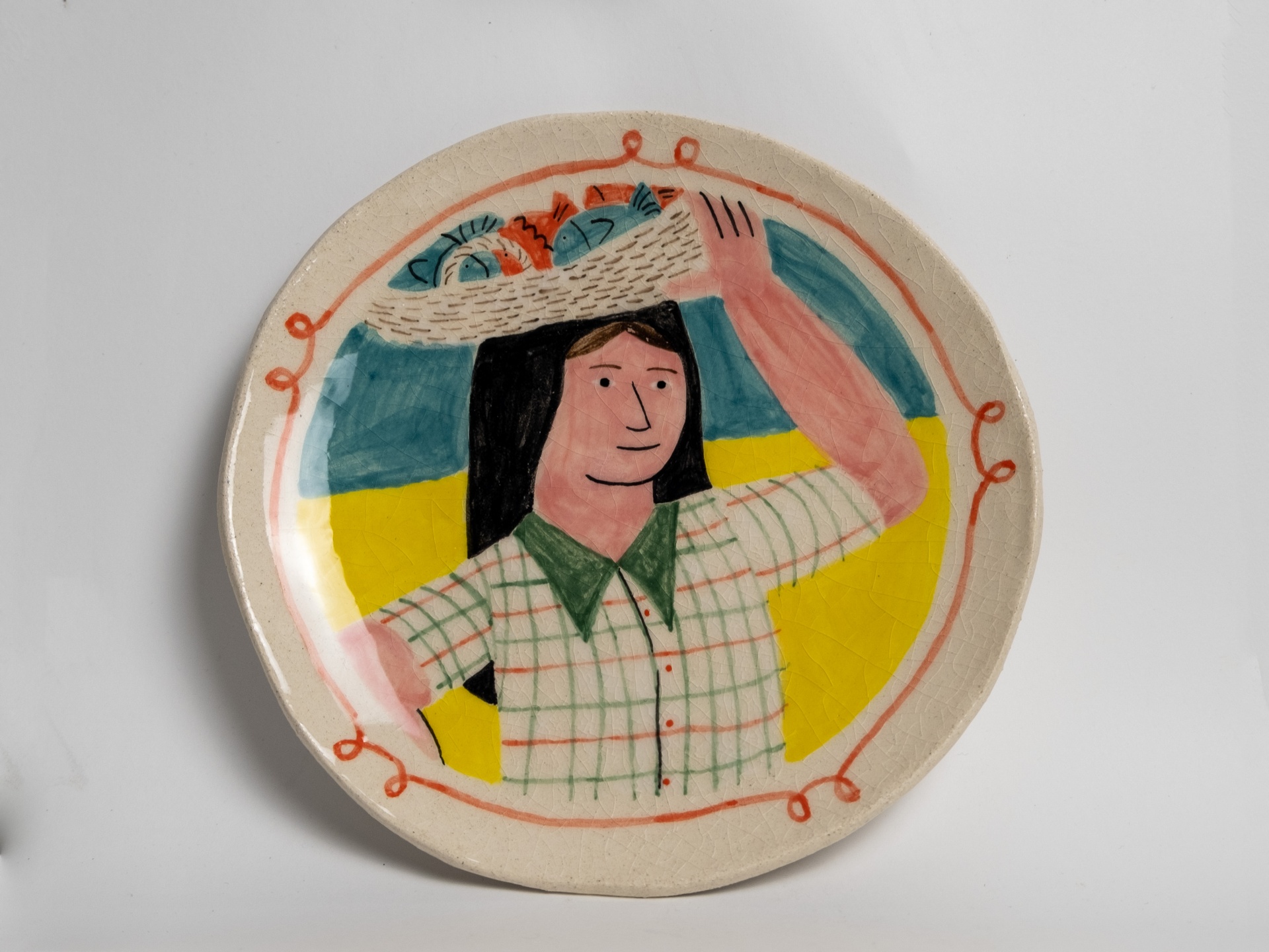 Prato decorativo de cerâmica com desenho de mulher e cesta de frutas