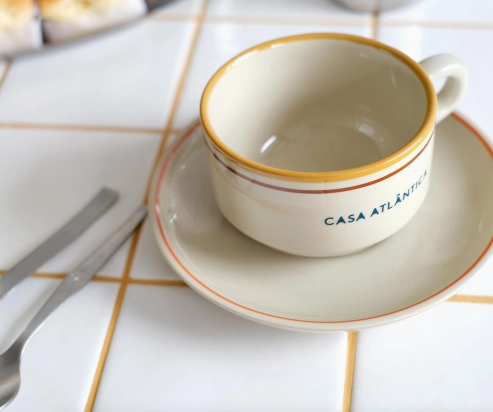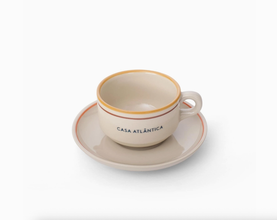 Conjunto de chávena e pires pintados à mão com bordas em tons de ocre, castanho e laranja. Inspirados nas louças vintage de bar, combinam simplicidade e design contemporâneo na cor natural do grés, conhecido pela sua durabilidade e estética única. Perfeitos para o uso diário, dão um toque de design à sua secretária.