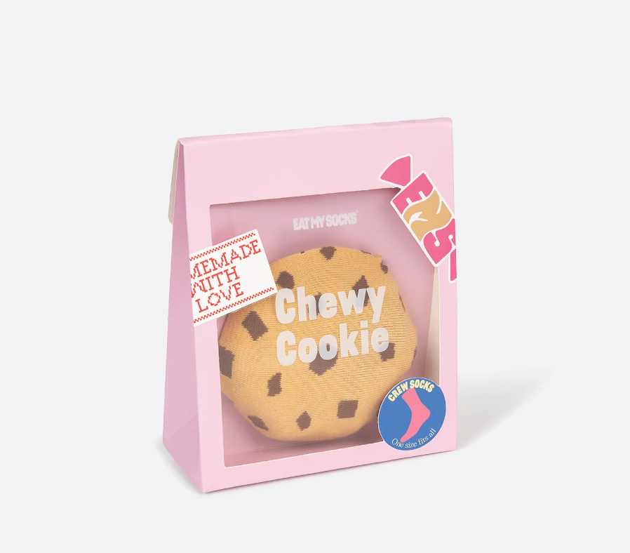 • Meias em forma de cookie de chocolate em embalagem rosa com texto visível