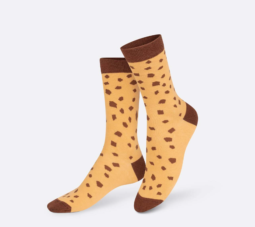 • Par de meias amarelas com manchas castanhas e detalhes castanhos
