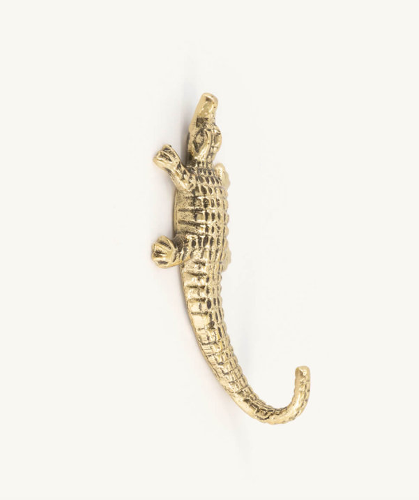 • Gancho de parede dourado em forma de crocodilo sobre fundo branco