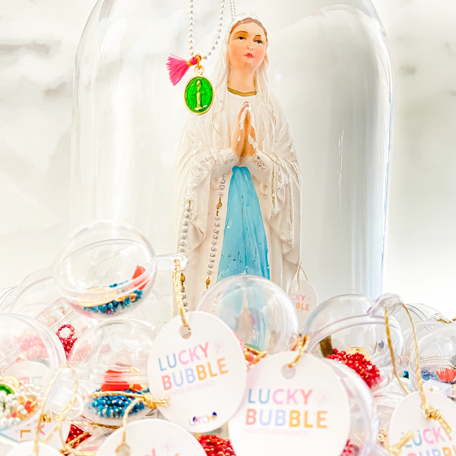 A Coleção Bubble Mary oferece-lhe joias coloridas e excêntricas, inspiradas nas madonas latinas. Belamente regressiva, ligeiramente transgressiva, declina a Virgem Maria em todas as cores. Os Colares Longos Bubble Mary são apresentados com toda a fantasia numa pequena bolha de Plexiglas. Disponível em 6 cores diferentes (turquesa, rosa, verde, amarelo, preto, vermelho), o colar Bubble Mary é o presente ideal para oferecer e provocar um sorriso.