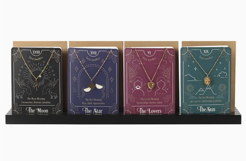 • Quatro colares dourados em embalagens temáticas astrológicas variadas numa base preta