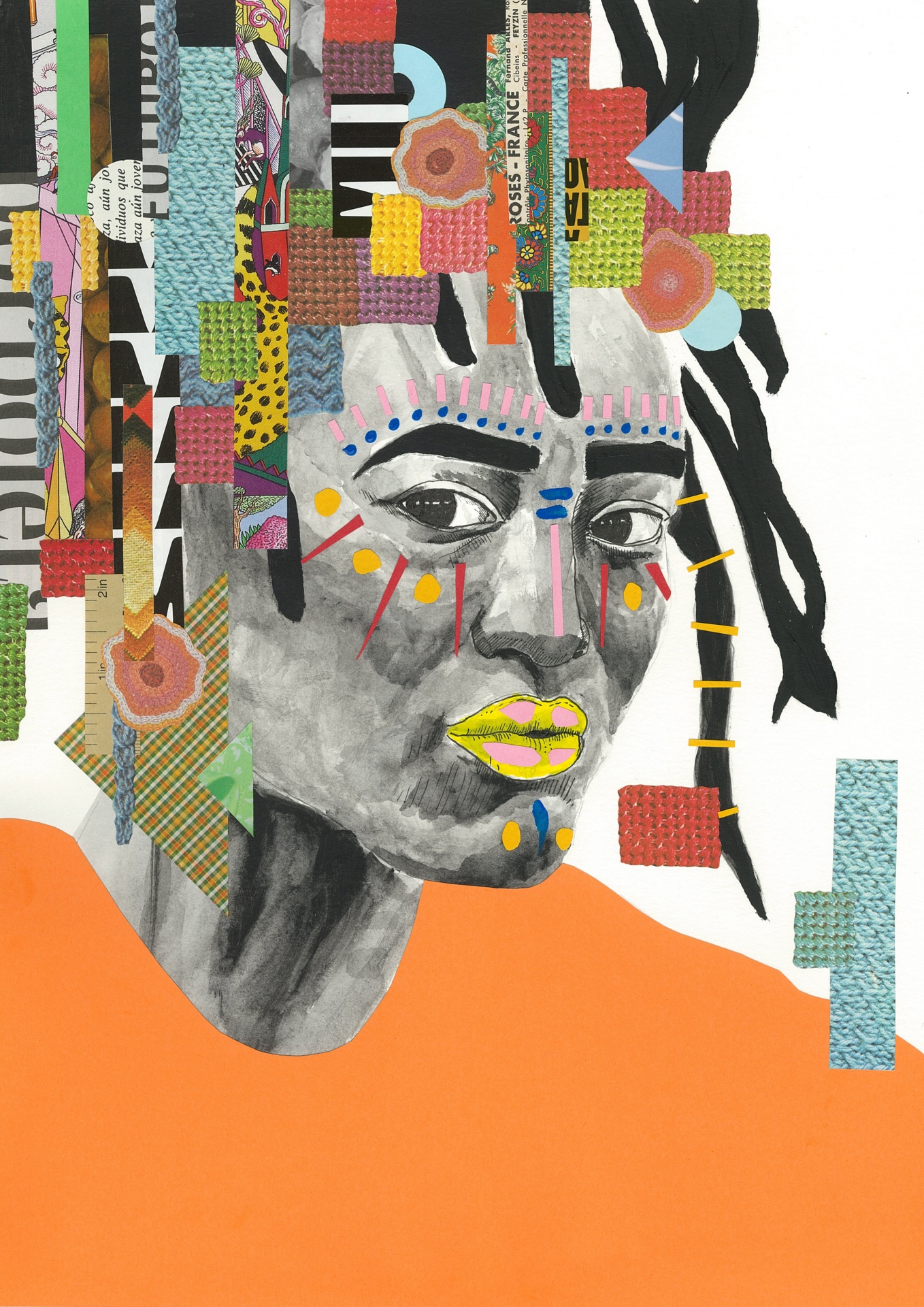 • Ilustração de rosto feminino com detalhes coloridos e fundo laranja