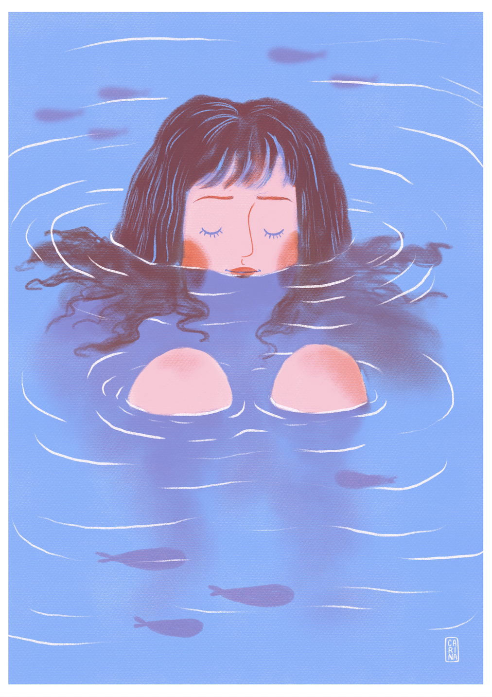 • Ilustração de mulher submersa em água azul com peixes