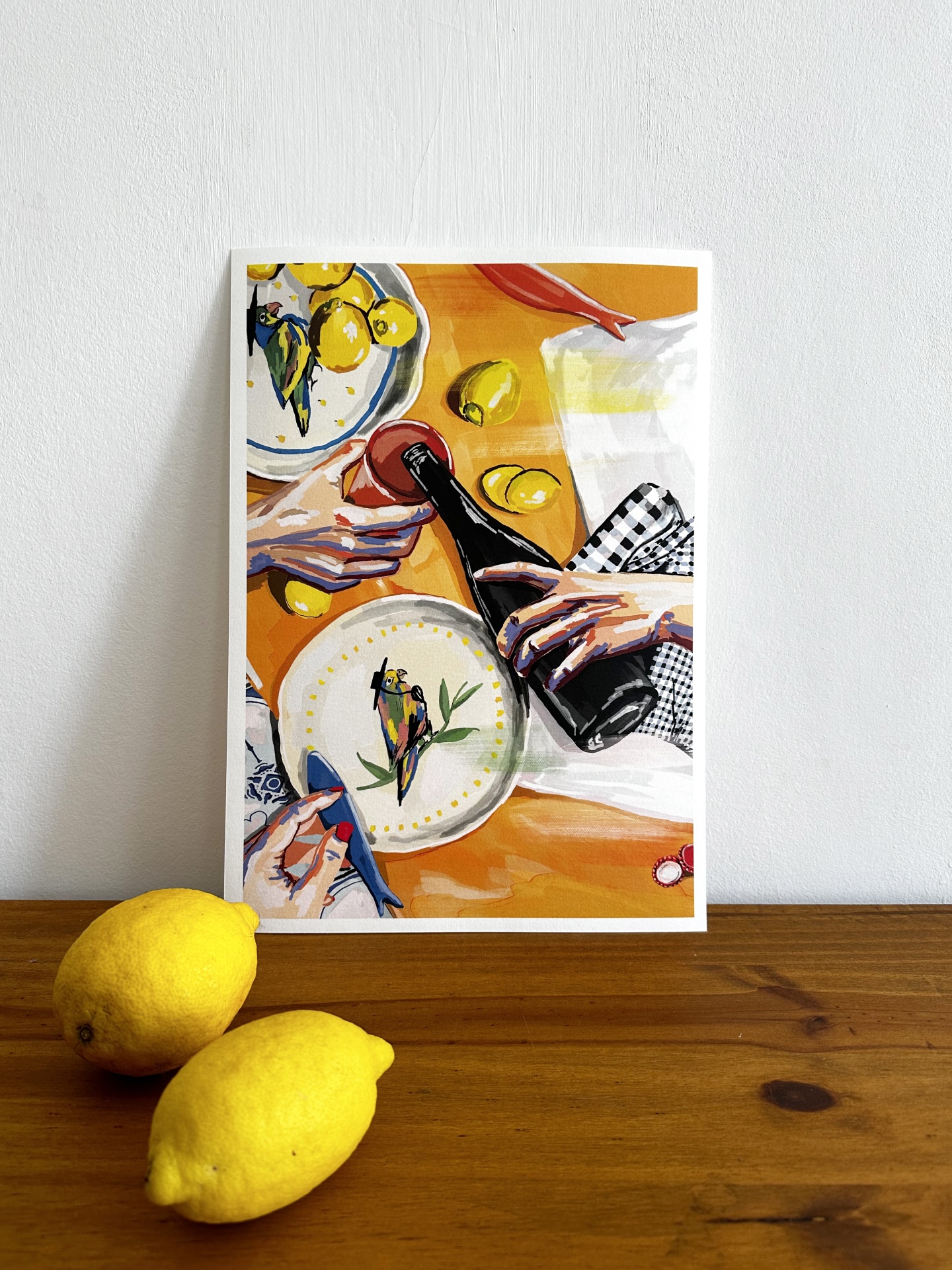 Postal com ilustração de mesa com pratos, mãos a servir vinho, limões e pano xadrez sobre mesa de madeira.