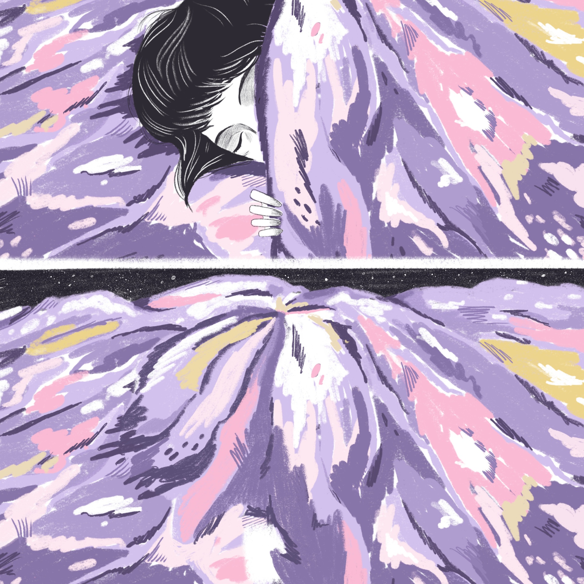 Ilustração de pessoa escondida debaixo de cobertor colorido em tons lilás, rosa, amarelo e branco