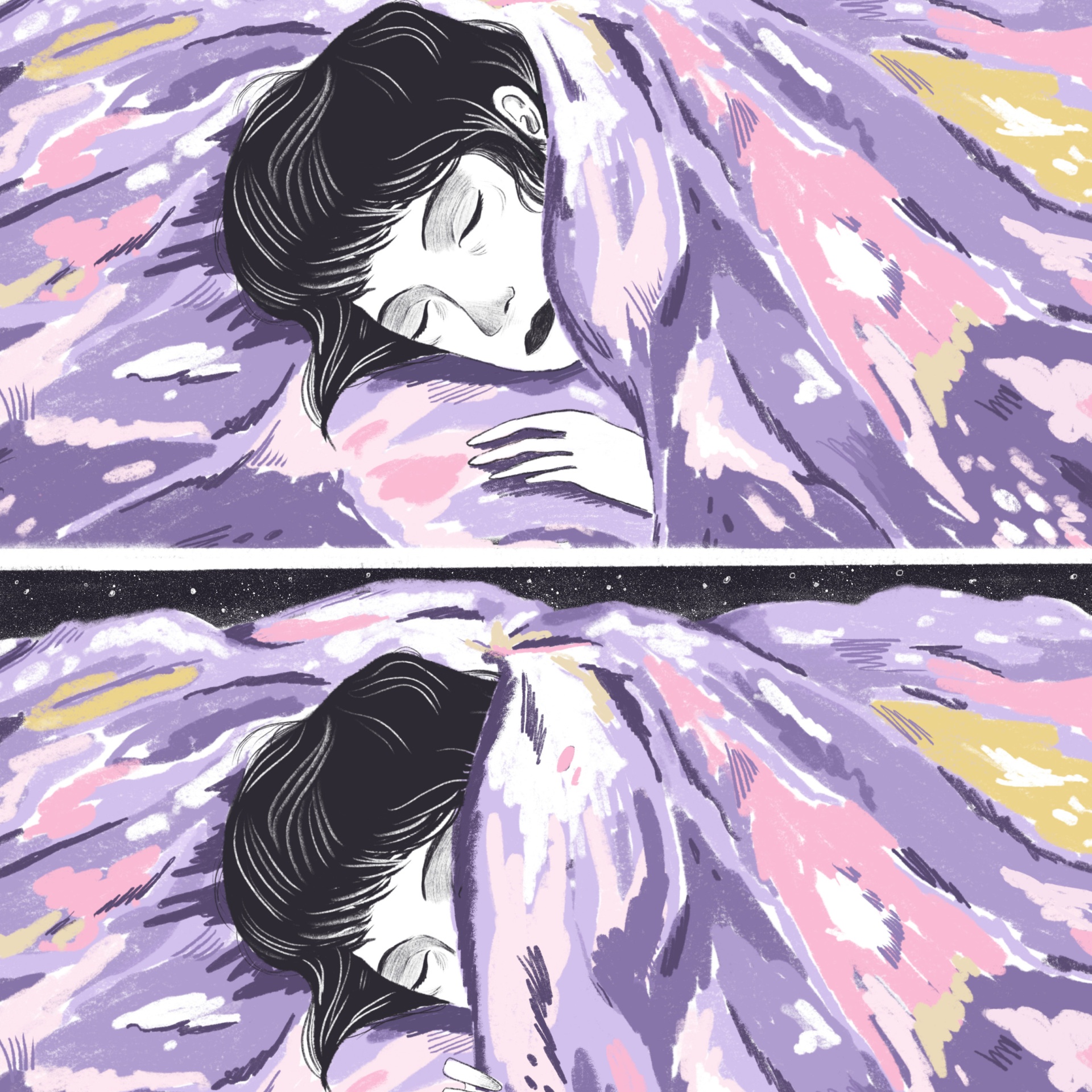 • Pessoa a dormir com cobertor colorido lilás e rosa com padrão abstrato