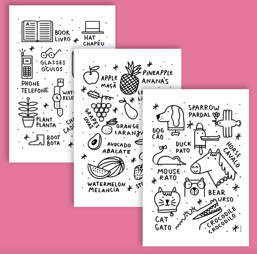 • Três cartazes educativos com palavras em inglês e português sobre objetos, frutas e animais.