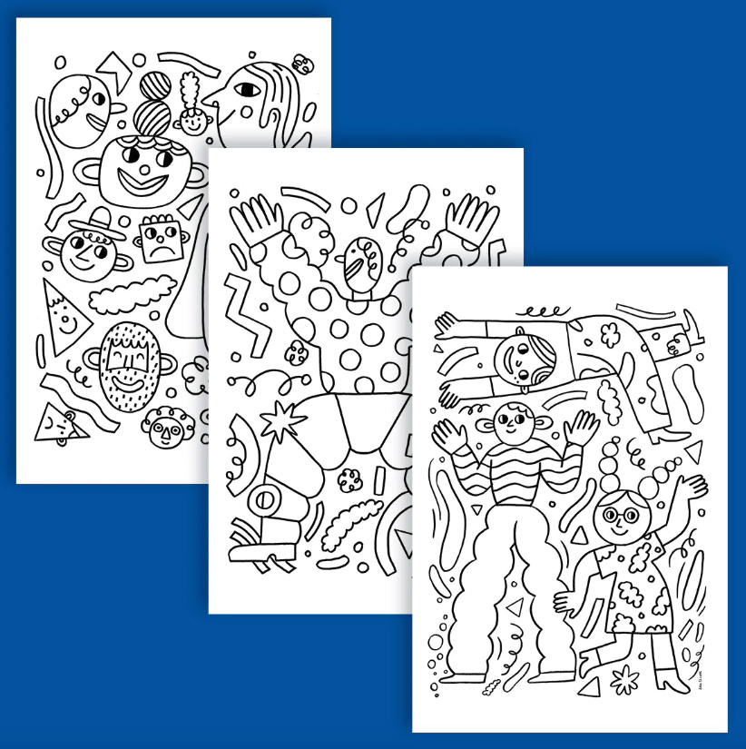 • Três folhas com desenhos em linha preta sobre fundo branco com figuras humanas e elementos abstratos