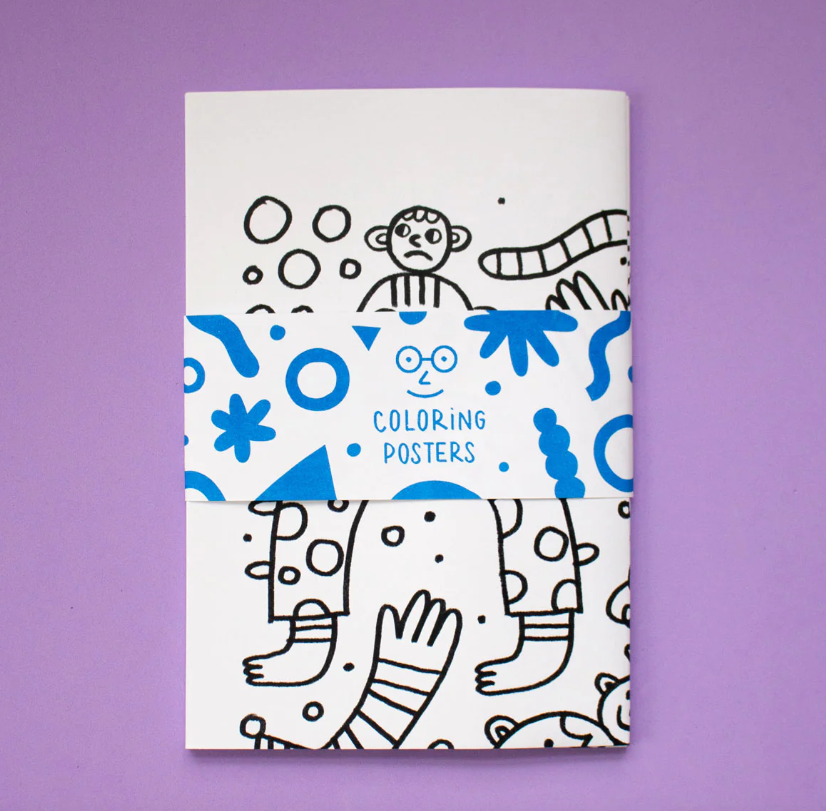 • Livro de posters para colorir COLORING POSTERS com ilustrações preto e branco e faixa azul em fundo lilás