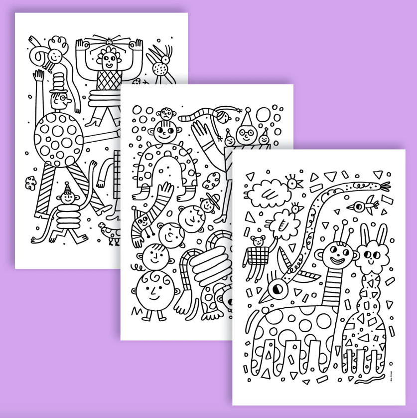 • Três páginas de desenhos para colorir com figuras humanas e animais em traço preto.