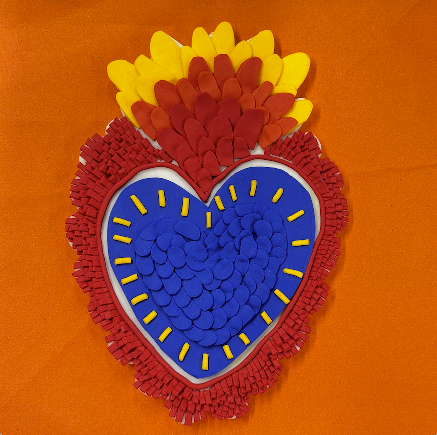 Arte decorativa em forma de coração com texturas e cores vibrantes sobre fundo laranja