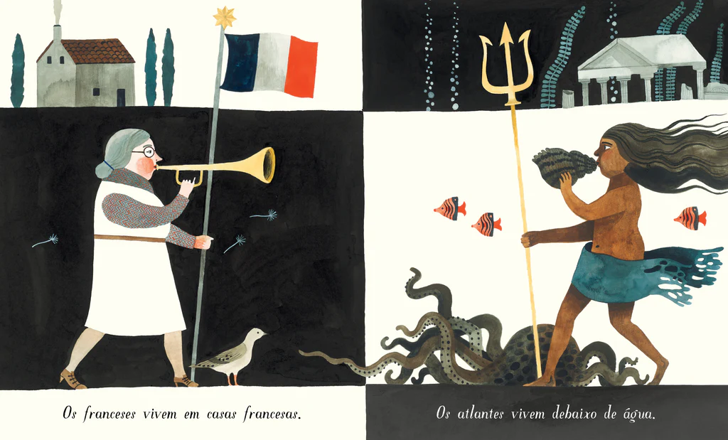• Ilustração com mulher francesa e figura mítica atlante dividida em duas cenas contrastantes.