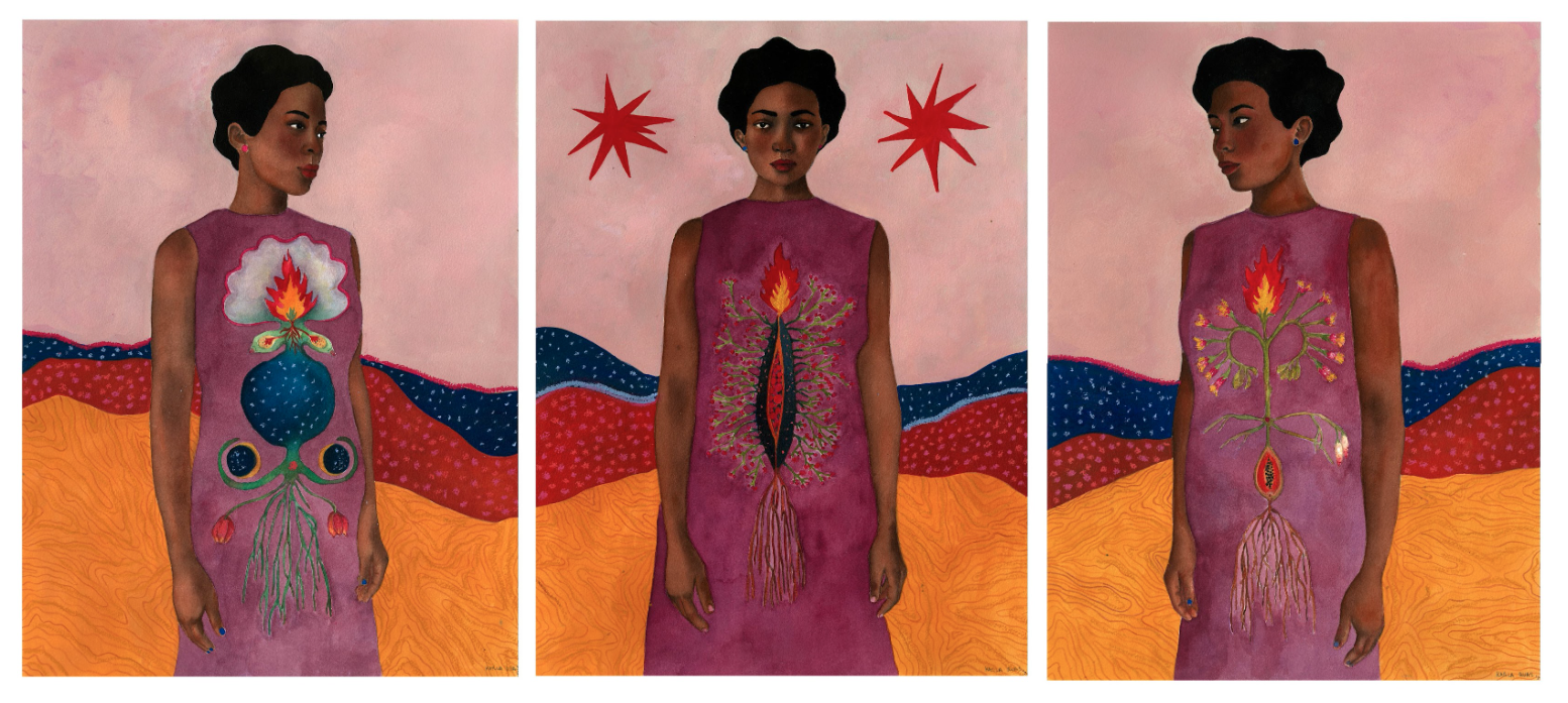 Tríptico com mulher de vestido roxo e padrões coloridos em fundo ondulado amarelo, vermelho e azul