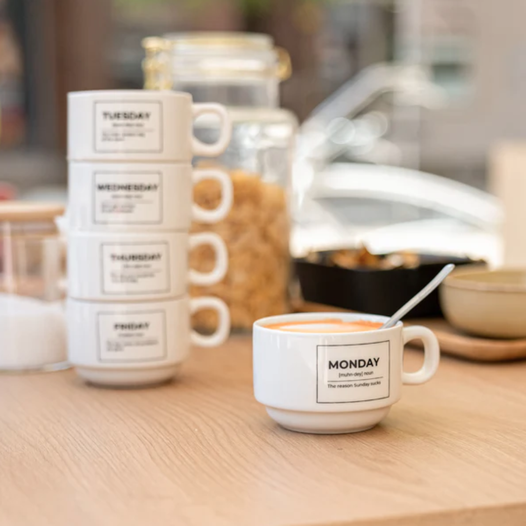 • Chávenas de café brancas com nomes dos dias da semana, empilhadas em mesa de madeira clara
