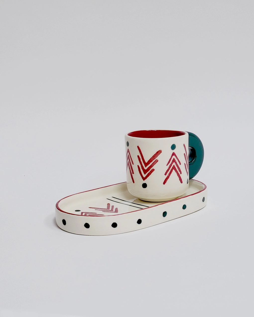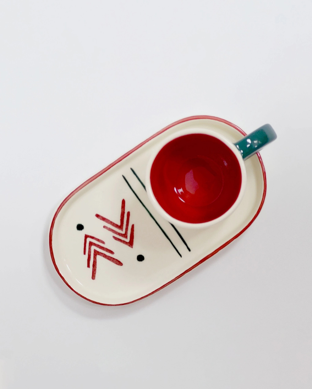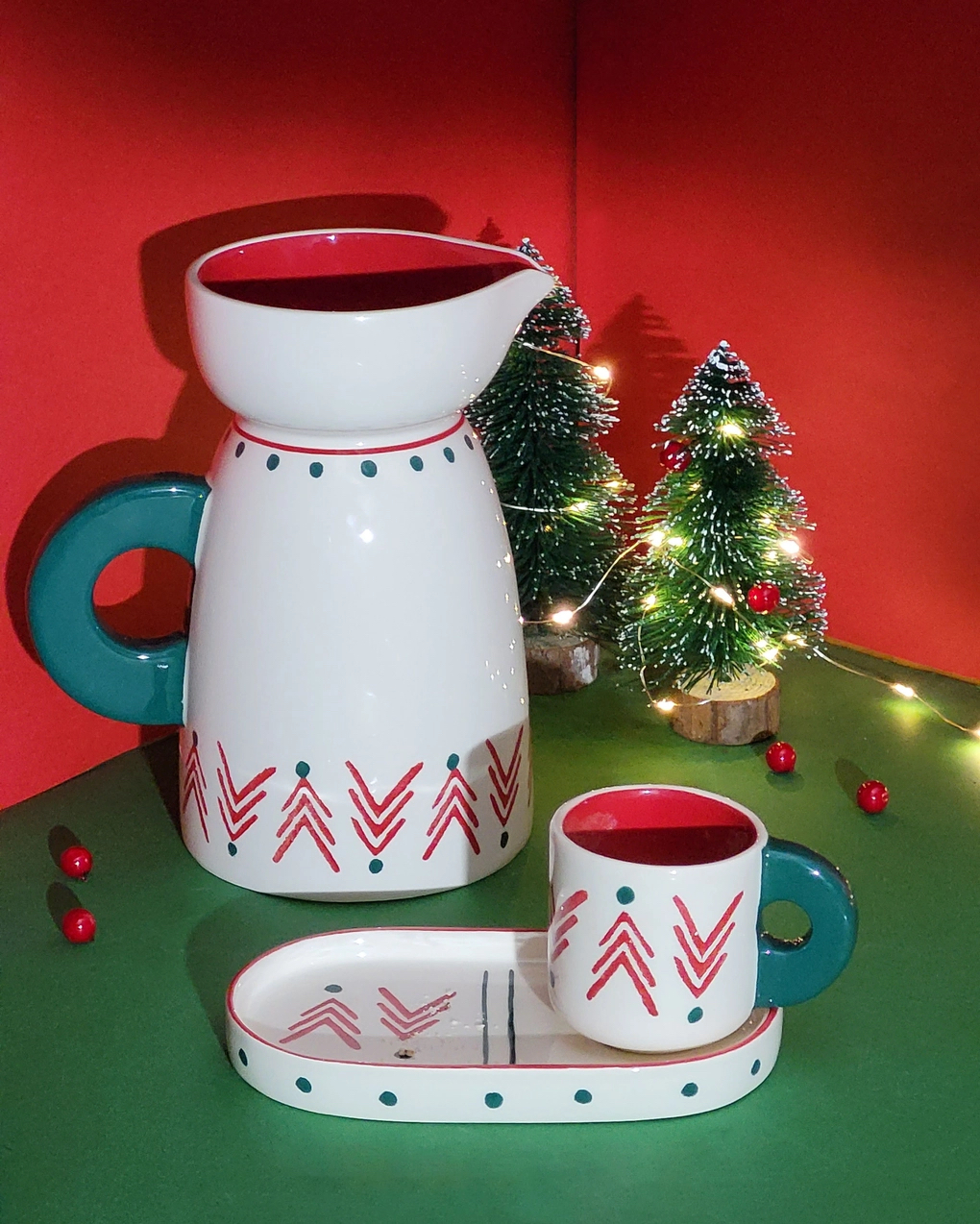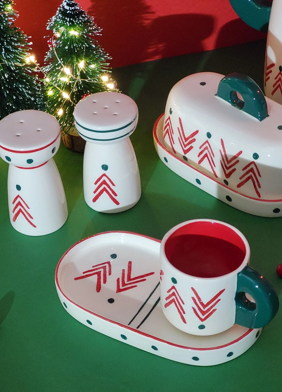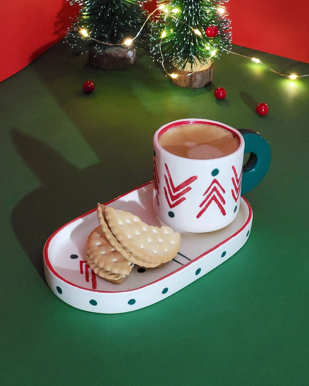 Prepare-se para a chegada do Papai Noel com o nosso Conjunto Cookies for Santa. Inclui uma caneca de café expresso e uma mini bandeja de biscoitos, perfeita para deixar de fora um deleite especial na véspera de Natal. Abrace o espírito da estação com a nossa Coleção Floresta de Natal e transforme a sua casa num país das maravilhas do inverno. Esta coleção é desenhada em vermelho carmesim rico e o verde mais vibrante, evocando o espírito festivo e a beleza exuberante de uma floresta enfeitado com esplendor de Natal. Todas as peças “Pó de Barro” são únicas. Devido à produção artesanal todos os produtos apresentam variações de formas, cores e acabamentos.