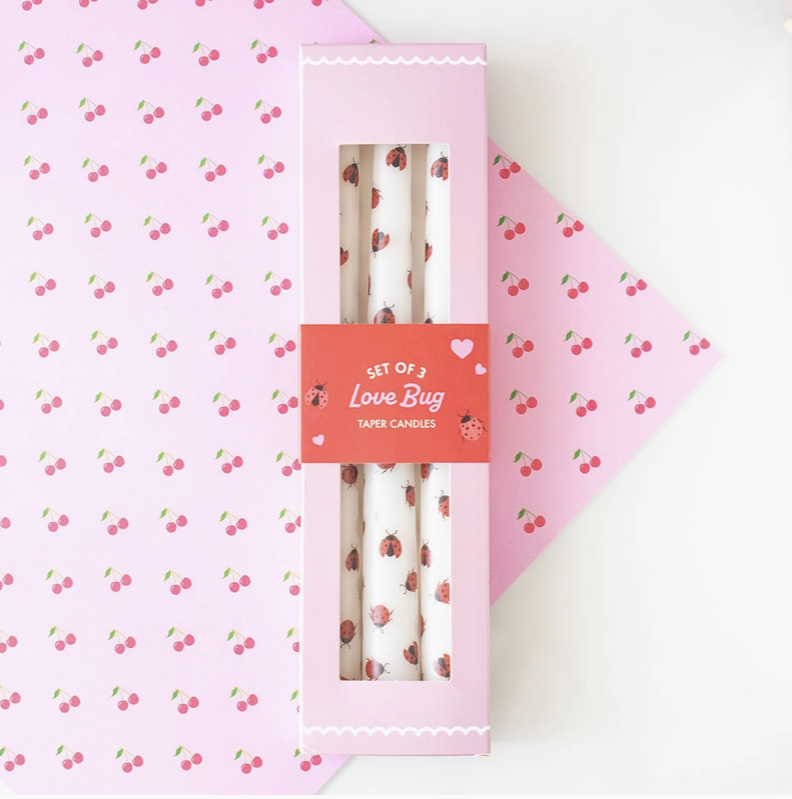 • Conjunto de 3 velas cónicas decoradas com padrão de joaninhas na caixa rosa com etiqueta vermelha sobre papel decorado com padrão de cerejas
