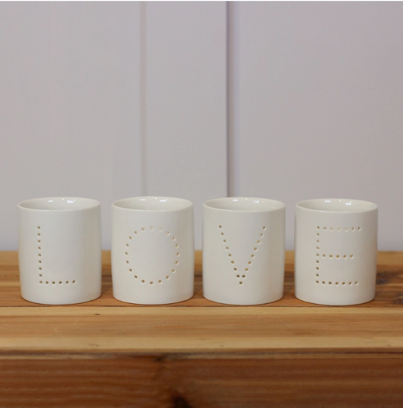 Este conjunto simplista e chique de três suportes de luz T de cerâmica em um decalque pontilhado com a expressão 'LOVE', é o acessório perfeito para qualquer casa.