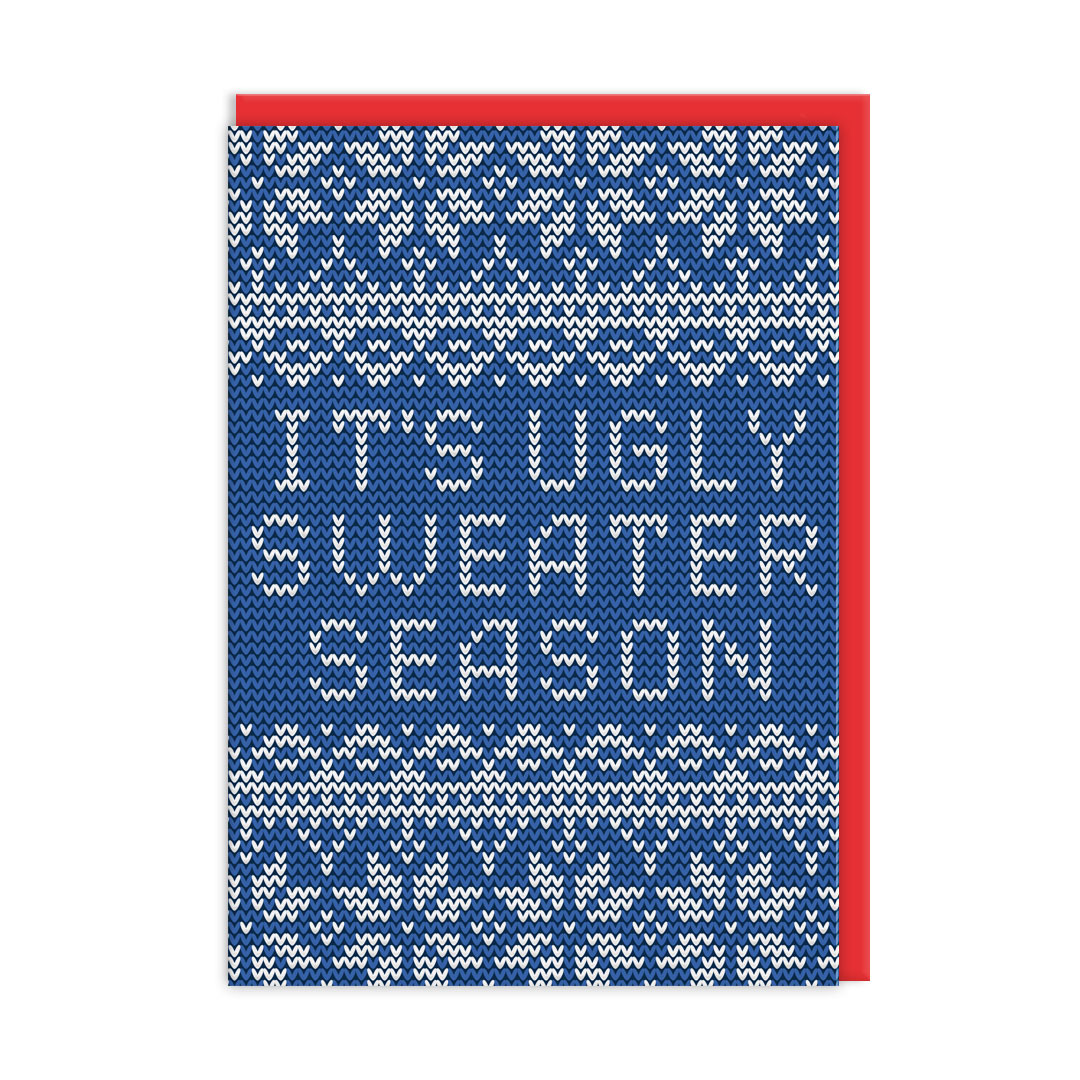 • Cartão com padrão de suéter azul e branco com texto ITS UGLY SWEATER SEASON