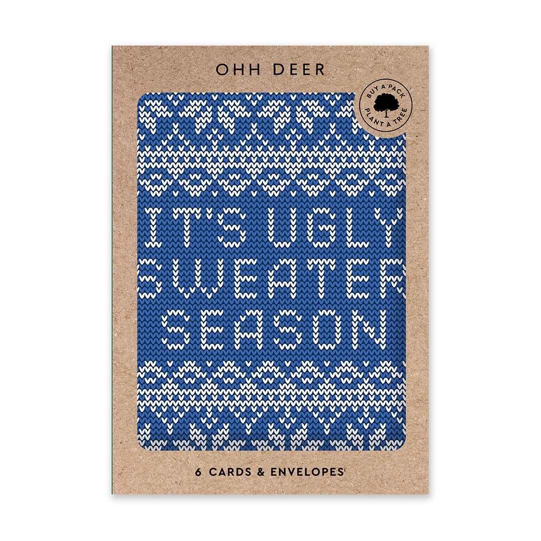 • Caixa com seis cartões e envelopes com design de suéter feio azul e branco