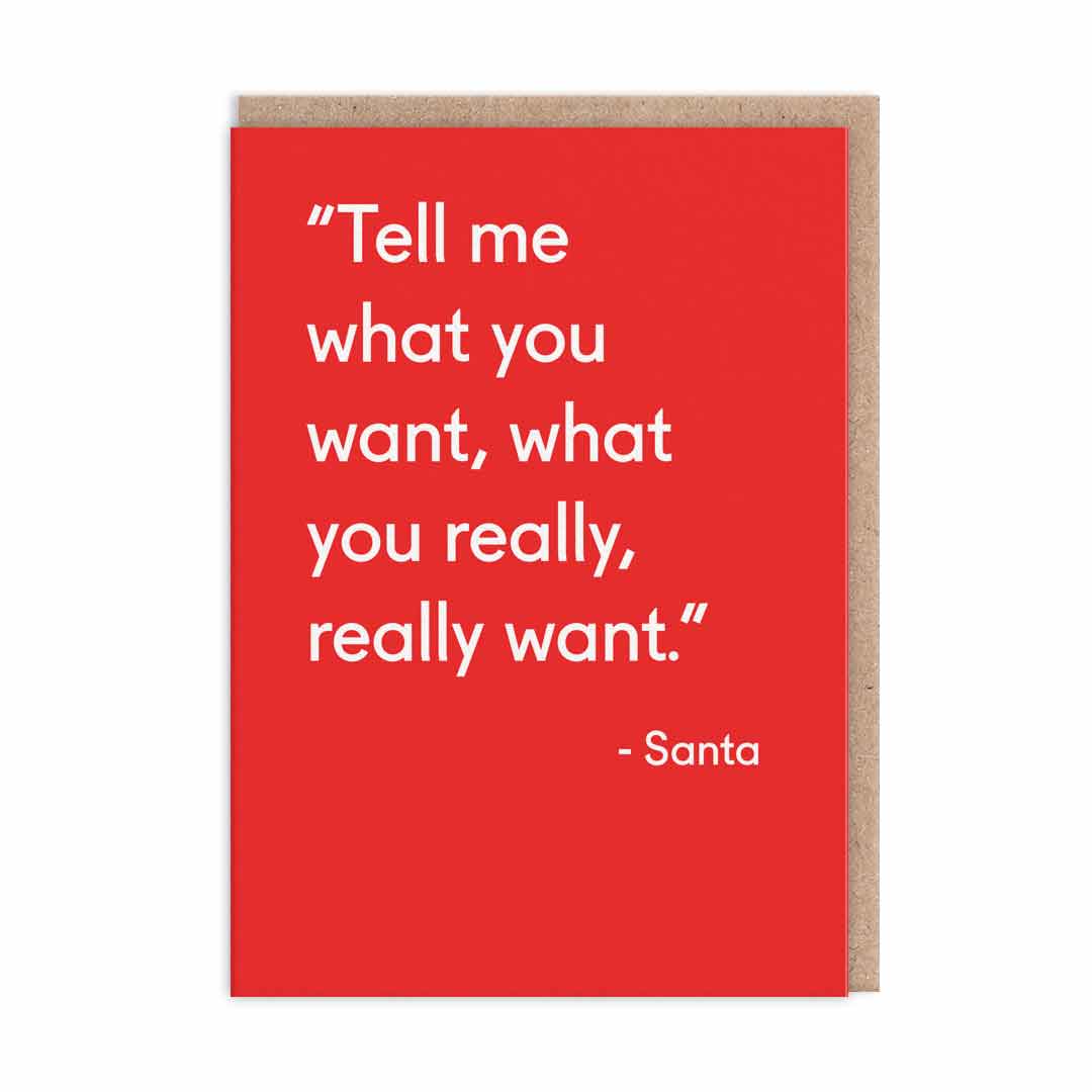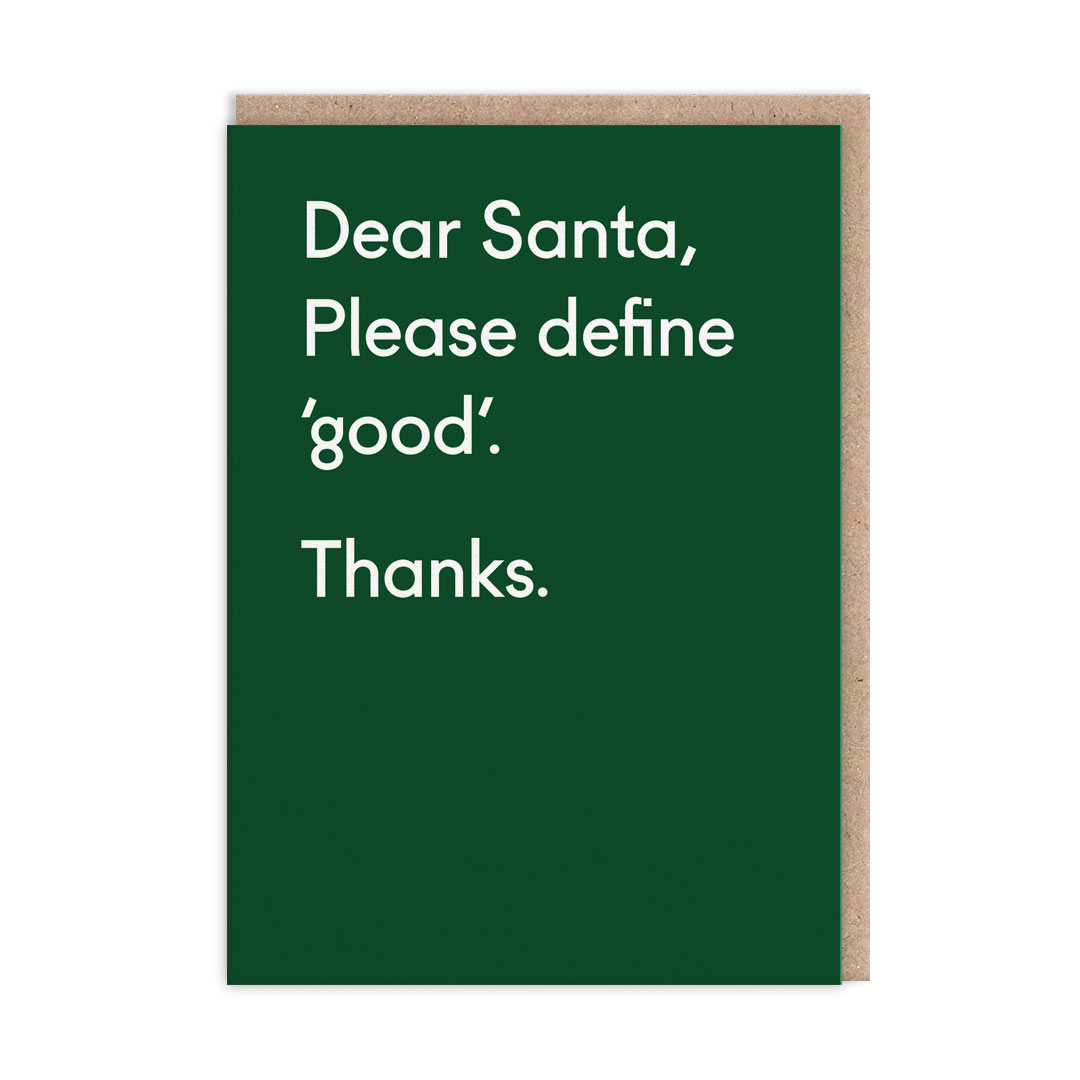 • Cartão postal verde com texto branco 'Dear Santa, Please define 'good'. Thanks.' e envelope castanho.
