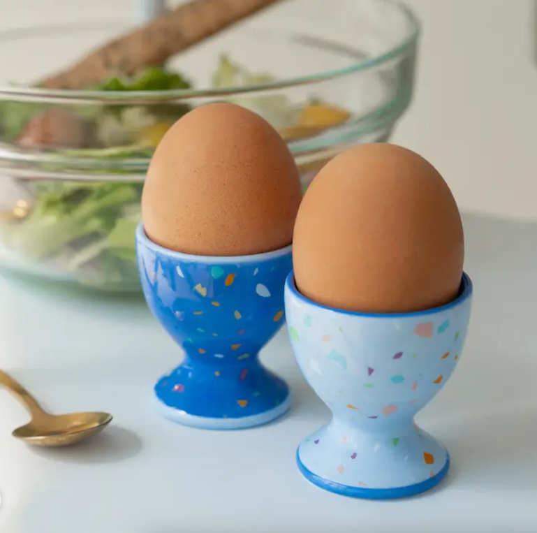 • Dois suportes para ovos em cerâmica azul com padrão colorido