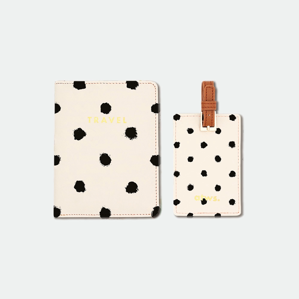 • Passaporte e etiqueta para bagagem creme com manchas pretas e detalhes dourados
