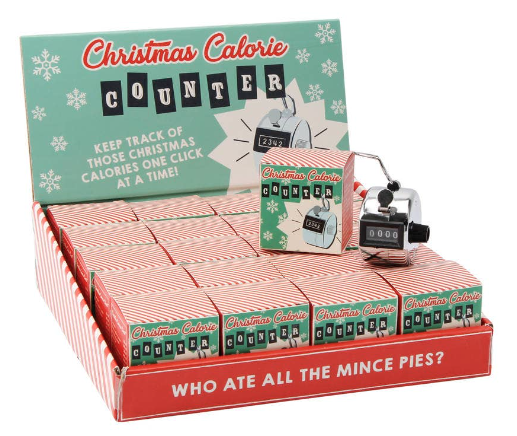 Contadores manuais prateados em caixas verdes e vermelhas para contar calorias de Natal