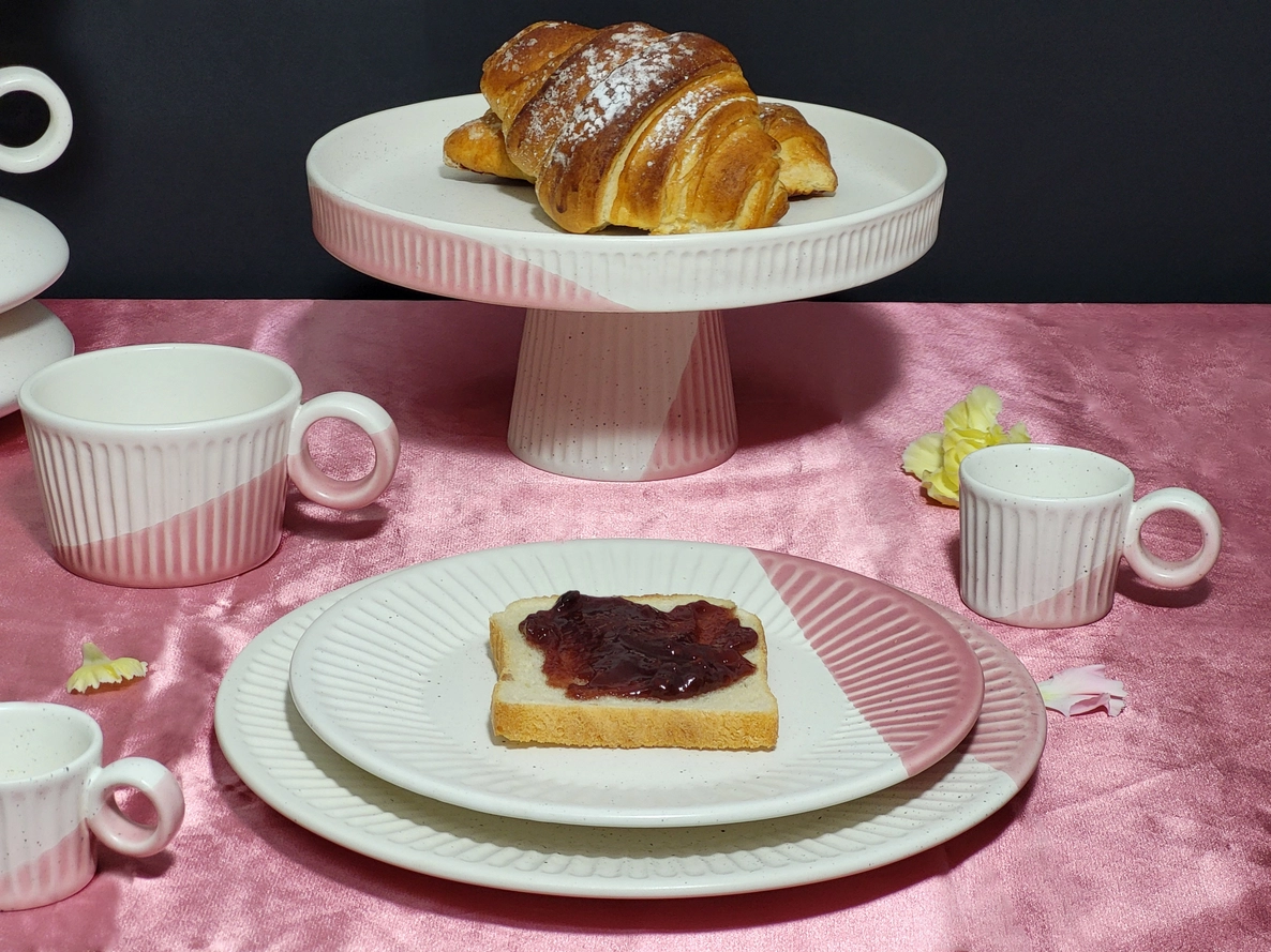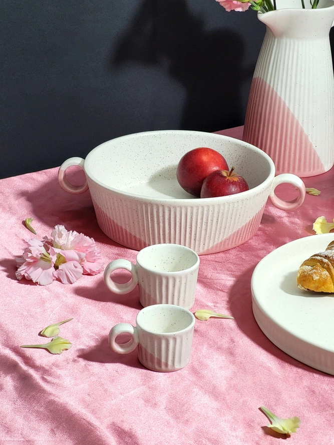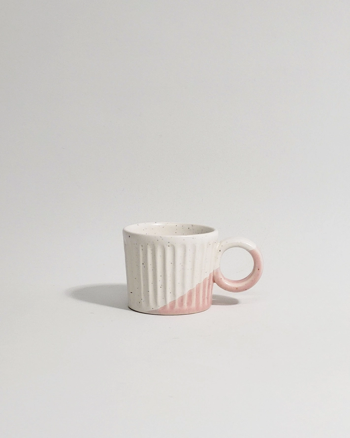 Caneca de café expresso dupla em cerâmica pintada à mão com um toque de rosa.