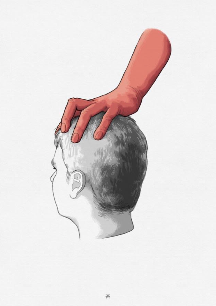 • Cabeça humana vista de perfil com grande mão vermelha pousada sobre ela