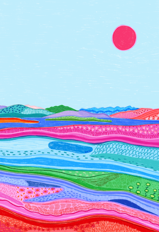 • Paisagem ilustrada com colinas coloridas e sol vermelho no céu azul