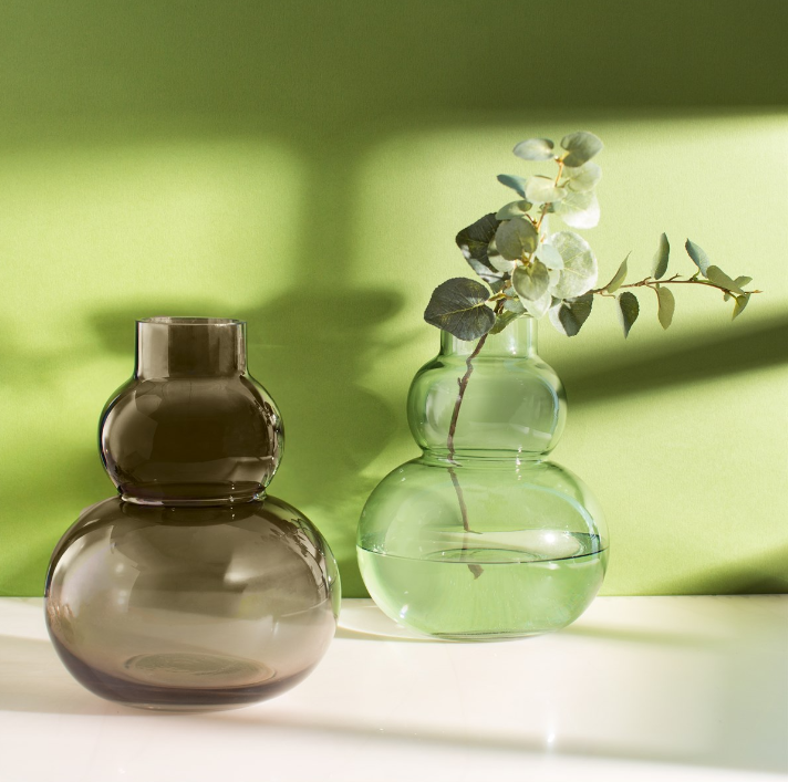• Dois vasos de vidro arredondados, um castanho e um verde claro, sobre superfície branca com parede verde ao fundo