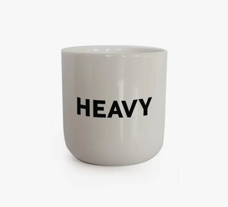 Copo cerâmico branco com palavra HEAVY em preto