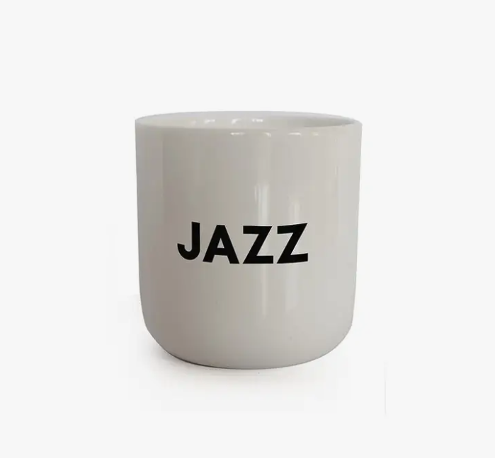 Caneca branca de cerâmica com a palavra JAZZ escrita a preto