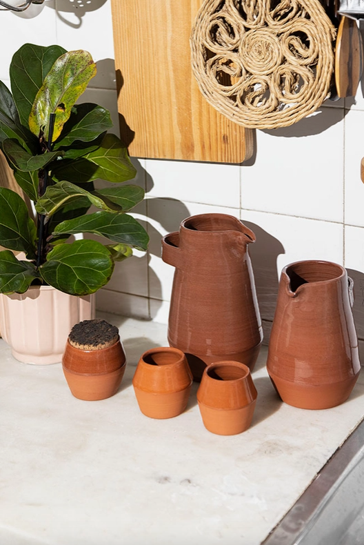• Conjunto de peças de barro verniz castanho e planta verde numa bancada de cozinha branca