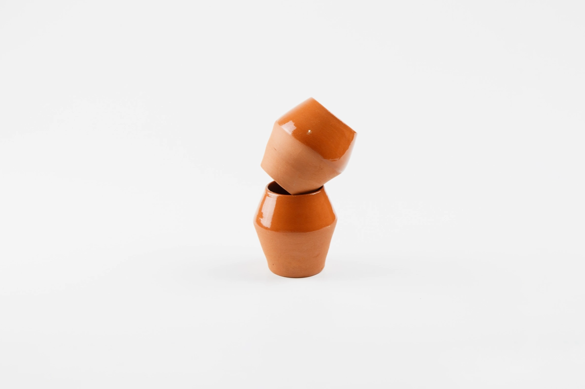 Dois pequenos vasos de barro cor terracota empilhados em fundo branco