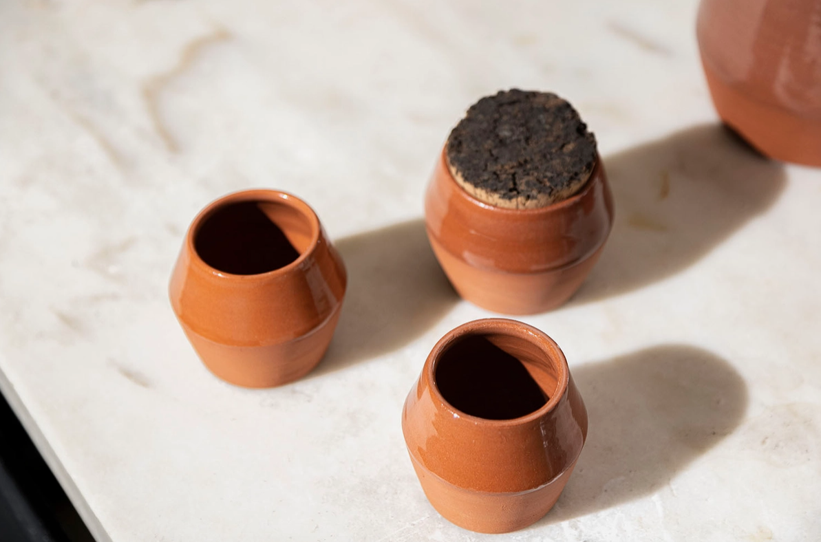 • Três vasos pequenos de terracota sobre mesa de pedra clara
