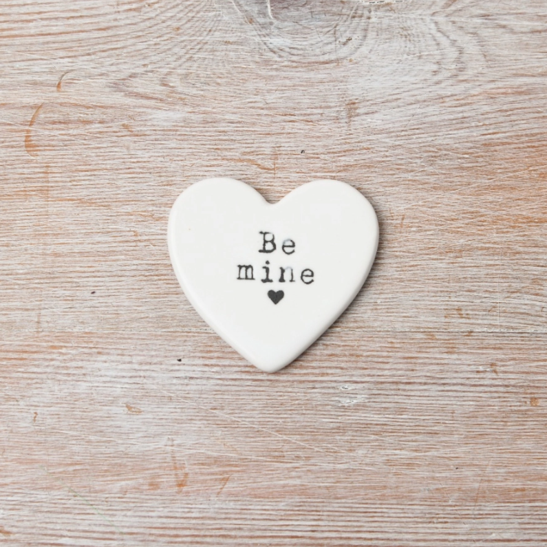 Um doce símbolo de coração de porcelana com o texto 'Be Mine' no centro.
