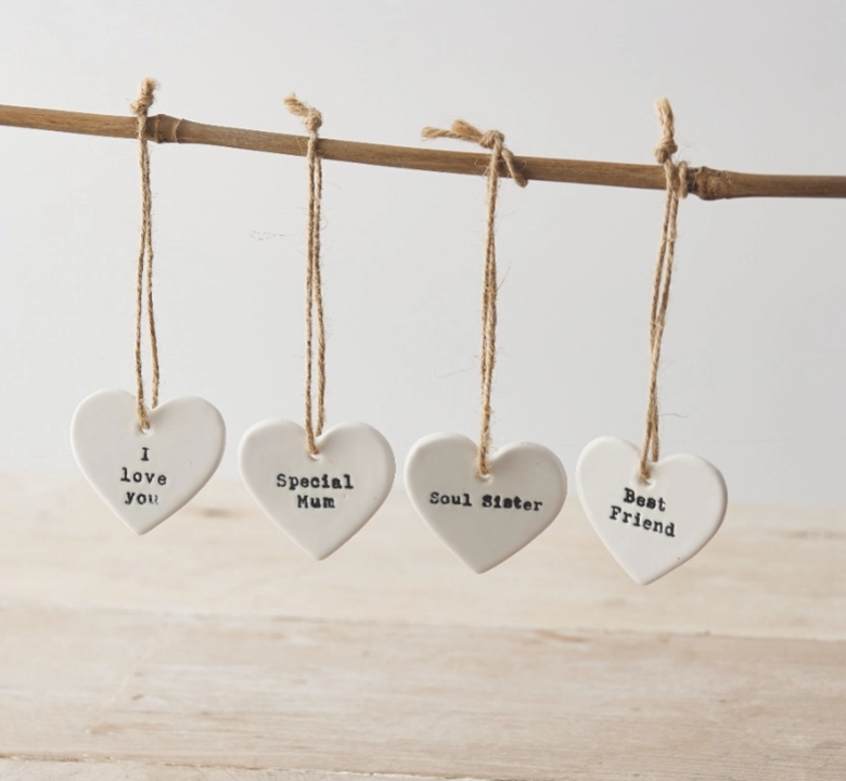 • Decorações de coração em cerâmica branca com mensagens penduradas num ramo