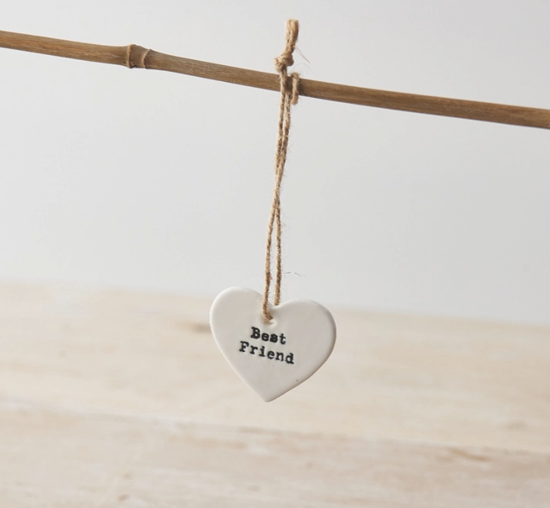 Um coração de cerâmica branca, simples mas elegante decoração pendurada com mensagem “Best Friend”.