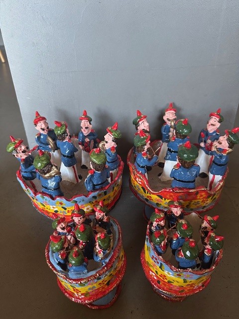 • Figuras decorativas coloridas em resina representando grupos de homens vestidos com casacos azuis e chapéus vermelhos e verdes sobre bases redondas florais.