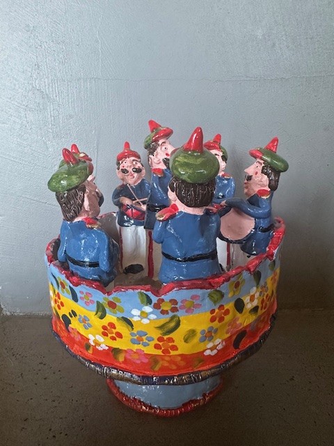 • Peça decorativa de cerâmica com seis figuras masculinas em círculo e base floral colorida