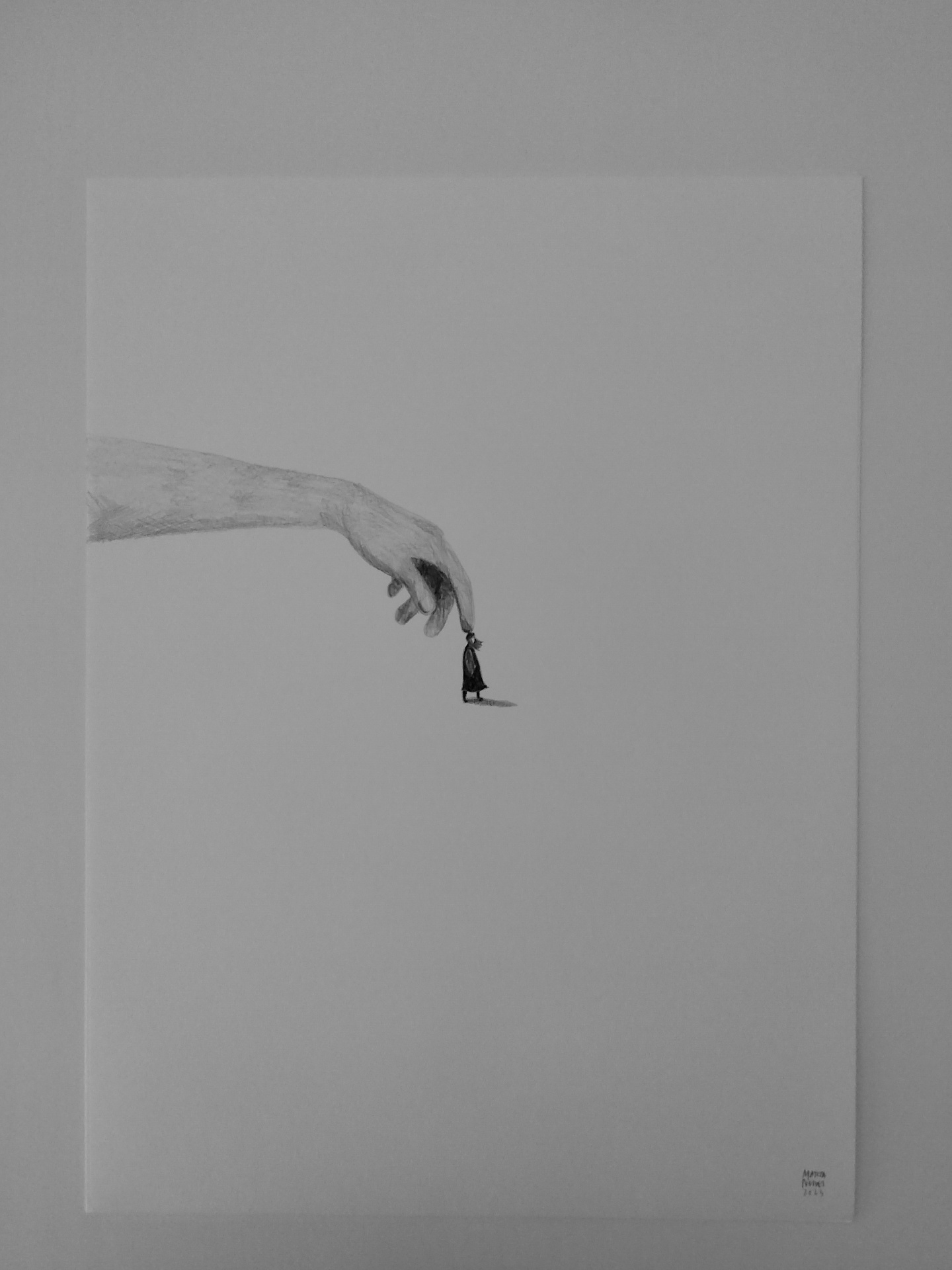 Poster minimalista preto e branco com desenho de braço segurando pequena figura humana