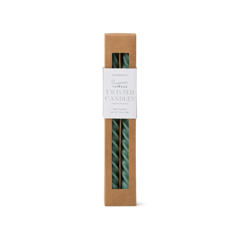 Suited perfectly to give as a gift or for everyday entertaining, the Evergreen Twisted Taper Candles add flickering light and a touch of colour to any mantel, dinner table, or celebration!