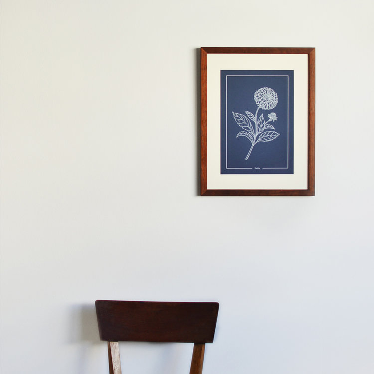 • Pôster azul com desenho branco de flor e folhas com texto Dahlia