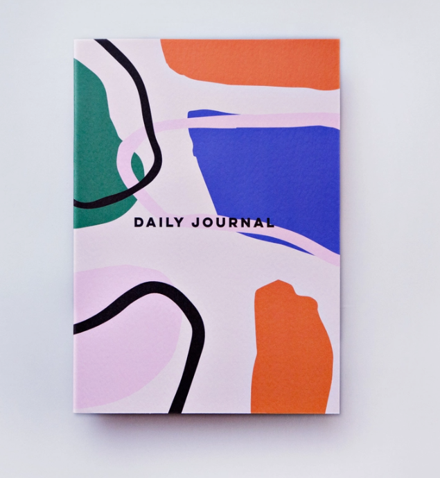 • Caderno com capa colorida abstrata e texto DAILY JOURNAL