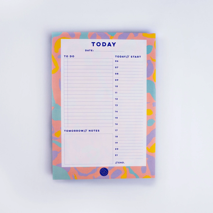 • Bloco de notas diário com capa colorida e áreas para tarefas e notas