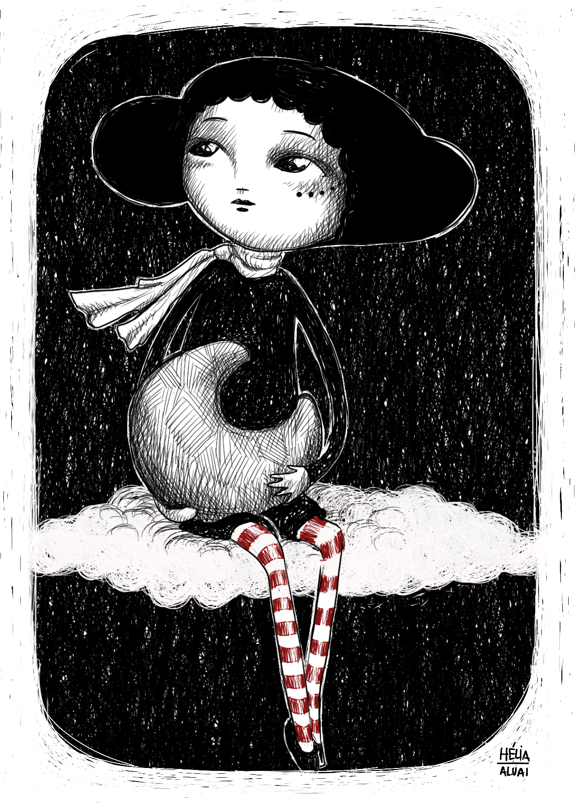 • Desenho em preto e branco com detalhes vermelhos de uma personagem sentada numa nuvem segurando uma lua